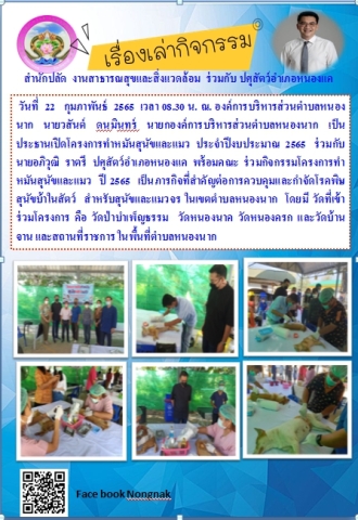 วันที่ 11 กุมภาพันธ์ 2565 งานสาธารณสุขและสิ่งแวดล้อม อบต.หนองนาก ร่วมกับ ปศุสัตว์อำเภอหนองแค จัดทำโครงการทำหมันสุนัขและแมว ประจำปีงบประมาณ 2565 เพื่อค...