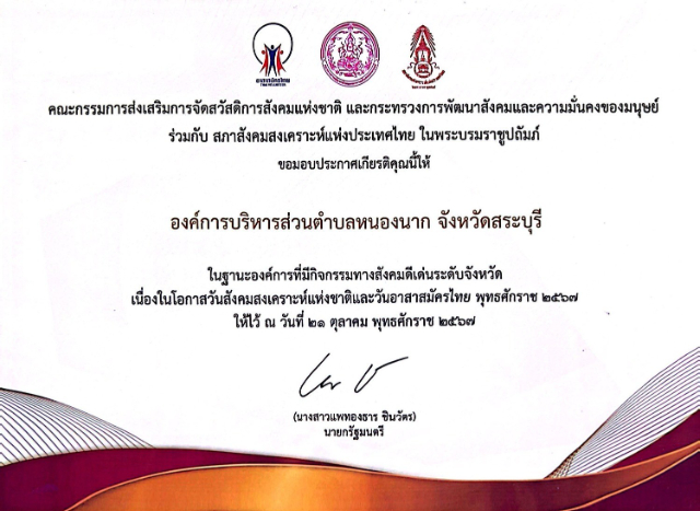 วันที่ 3 มกราคม 2568 นายวสันต์ ดนมินทร์ นายกองค์การบริหารส่วนตำบลหนองนาก รับใบประกาศเกียรติคุณ จากคณะกรรมการส่งเสริมการจัดสวัสดิการสังคมแห่งชาติ และกระทรวงการพัฒนาสังคมและความมั่นคงของมนุษย์ ร่วมกับ สภาสังคมสงเคราะห์แห่งประเทศไทย ในพระบรมราชูปถัมภ์ "ในฐานะองค์การที่มีกิจกรรมทางสังคมดีเด่นระดับจังหวัด เนื่องในโอกาสวันสังคมสงเคราะห์แห่งชาติและวันอาสาสมัครไทย พุทธศักราช 2567" โดยมี นายบัญชา เชาวรินทร์ ผู้ว่าราชการจังหวัดสระบุรี เป็นผู้มอบบประกาศเกียรติคุณ ณ ห้องประชุมพระพุทธบาท ชั้น 4 ศาลากลางจังหวัดสระบุรี ตำบลตะกุด อำเภอเมืองสระบุรี จังหวัดสระบุรี