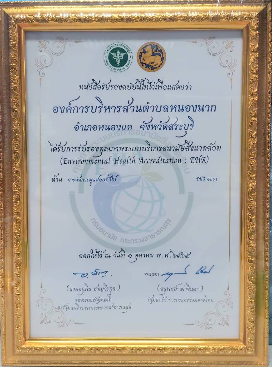 องค์การบริหารส่วนตำบลหนองนาก ได้รับการรับรองคุณภาพระบบริการอนามสิ่งแวงแวลล้อม (Environmental Health Accreditation : EHA) ด้าน การจัดการมูลฝอยทั่วไป